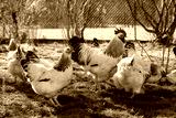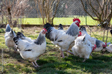 Coq sussex et poules dans un jardin avec soleil au printemps