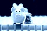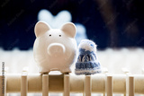 Une tirelire cochon en céramique de couleur blanche posée sur un vieux radiateur blanc avec un petit bonnet en laine bleu