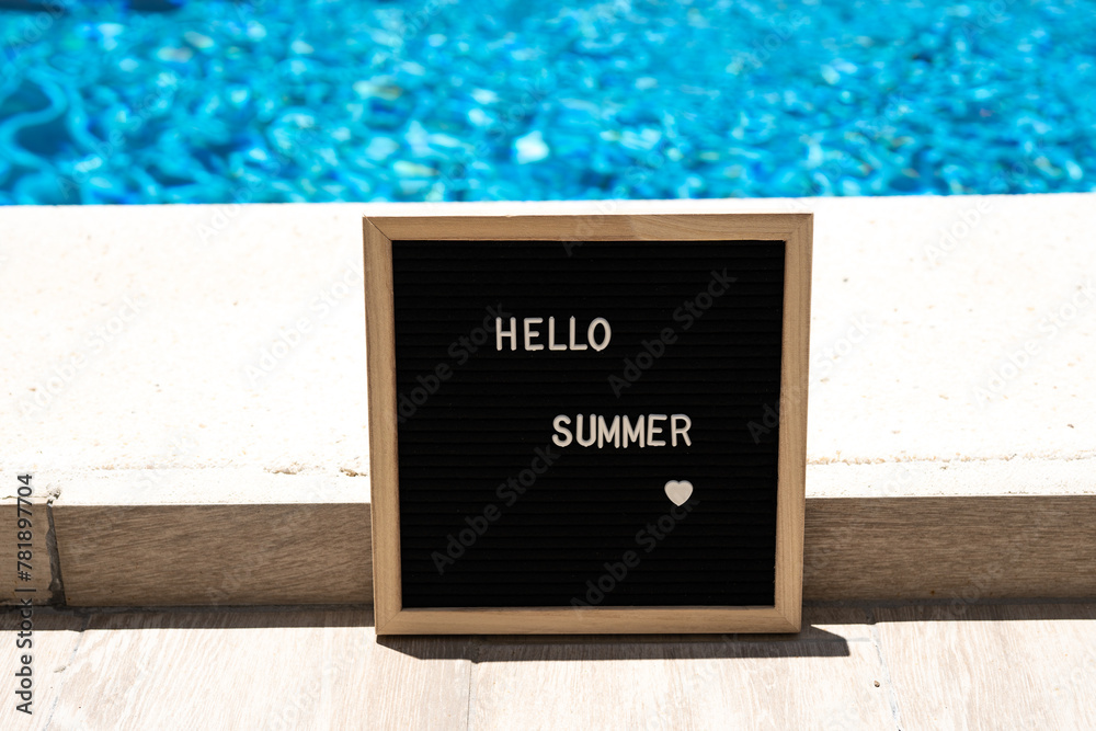 Hello summer text on chalkboard on pool background on summer sunny day