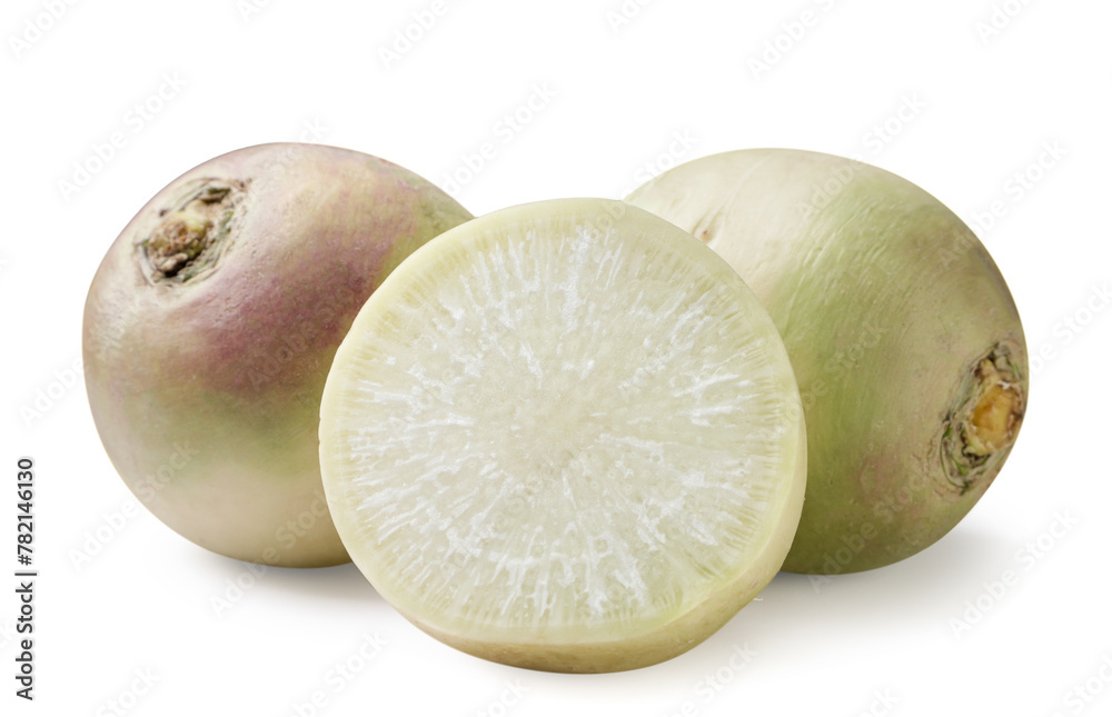 Green radish and half close-up on a white background.