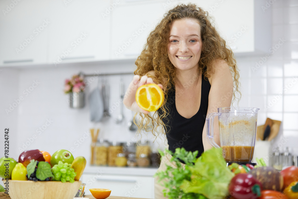 young woman holing orange mixing fruits from portable blender, and preparing smoothie in kitchen