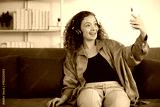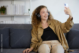 young woman with headphones and online video call from smartphone
