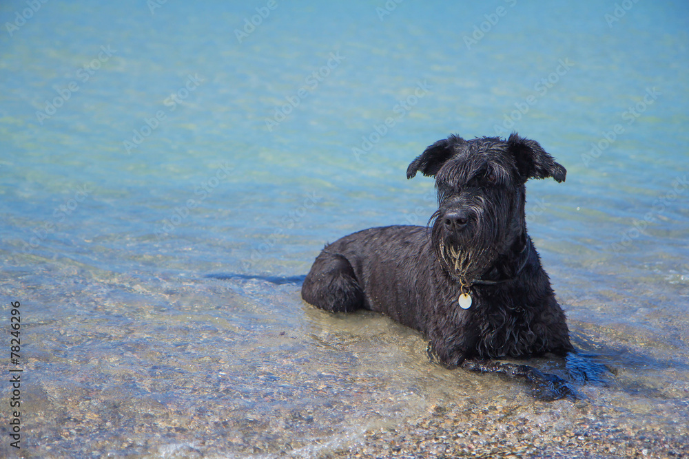 Big Black Schnauzer dog is is lying in the sea