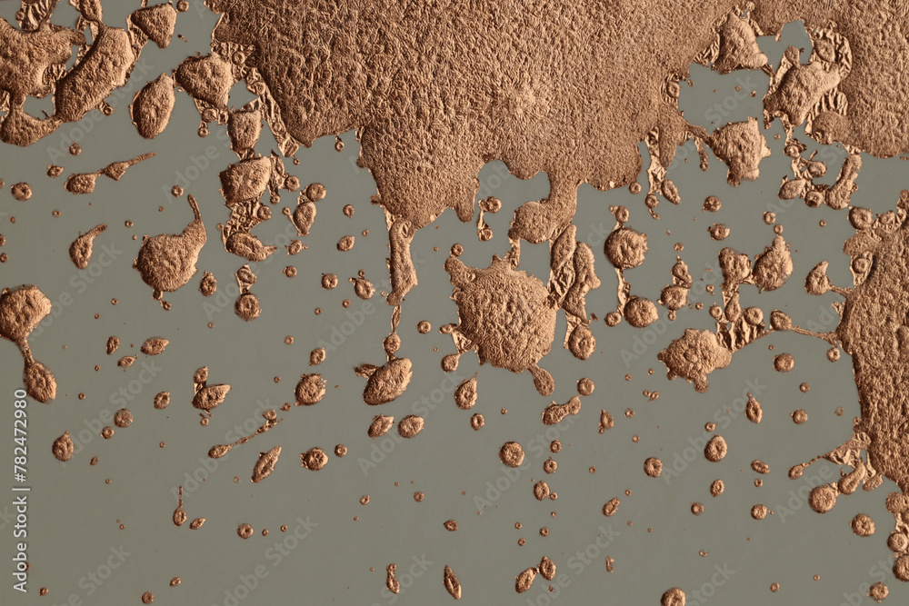Gold, bronze Glitter spray blot drops on beige. Abstract glow vintage paper background.