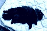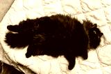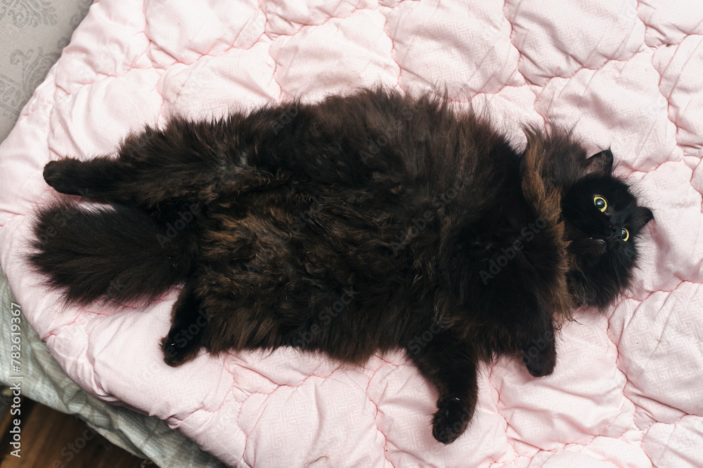 A fat fluffy black cat with yellow eyes against the background of a blanket and a sofa. The concept of home with comfort, relaxation and laziness. Prejudices and superstitions associated with bad luck
