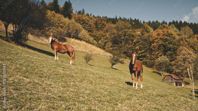 Horses posing camera at autumn mountain hill. Countryside nature landscape. Funny farm animals at grass pastures. Cottage at leafy trees forest. Picturesque Carpathian mounts, Ukraine, Europe