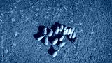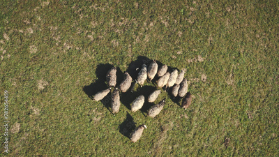 Top down aerial of sheeps eating grass at mountain valley. Farm animal. Nature landscape at autumn sunny day. Countryside scenery. Grassy pastures at Carpathian mounts, Ukraine, Europe