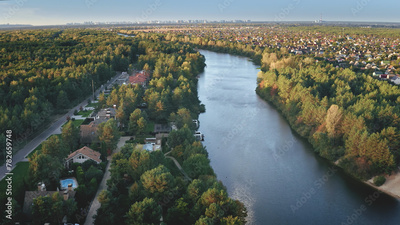 Green forest at river banks aerial. Autumn nobody nature landscape. Cityscape at stream. Downtown buildings. Urban streets with cottages. Cinematic Dnieper, Kiev city, Ukraine, Europe
