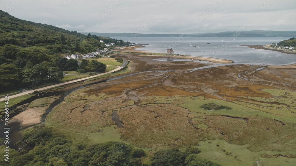 Slow motion of Scottish whisky distillery at village aerial. Road, cottages, houses at green mountain valley. Summer cloudy day. Nobody nature landscape of Arran Island, Scotland. Cinematic drone shot