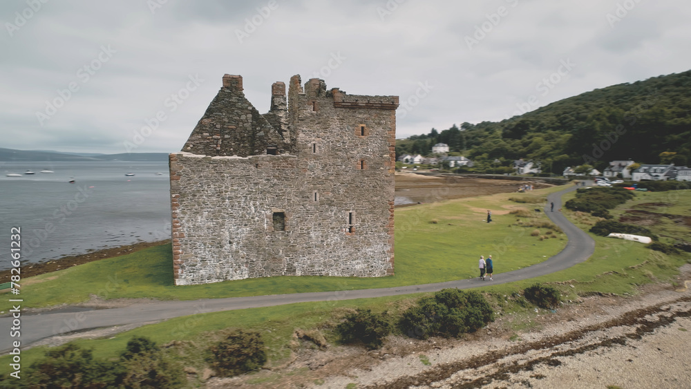 Closeup castle ruins at green mountain aerial. People walk on way of Loch Ranza ocean bay. Historical architecture landmark, heritage. Loch-Ranza, Arran Island, Scotland, United Kingdom, Europe