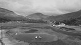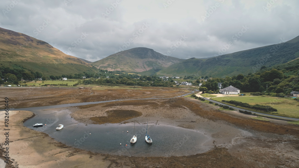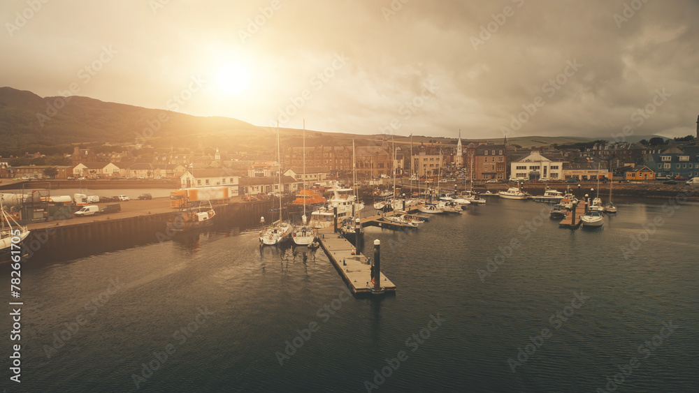 Sea gulls flying at brown sand beach on ocean shore aerial. Nature seascape with historical ancient castle ruins. Seagulls bird at summer cloudy day. Ships, yachts at harbor of Arran Island, Scotland