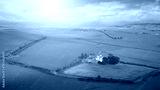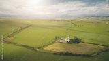 Sun shine at countryside landscape with farm aerial. Green pastures with animals. Rural farmland: cottages and barn at greenery valley. Campbeltown nature, Scotland, Europe. Cinematic sunlight shot