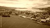 Port town cityscape with cottages aerial. Car park at traffic road with urban transportation. Lodges and houses at downtown streets. Brodick harbor city, Arran Island, Scotland, Europe. Cinematic shot