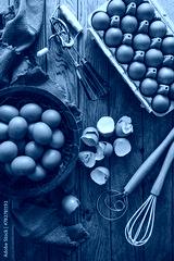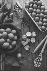 Fresh organic eggs with kitchen and baking utensils