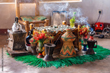 Ethiopian traditional coffee served with aromatic essence. Ceremony with Incense, frankincense and myrrh ignited by hot coal produce smoke that carries away bad any spirits. Debre Libanos, Ethiopia