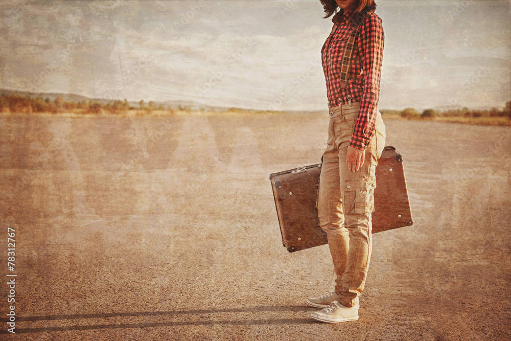 Woman with suitcase on road, vintage image