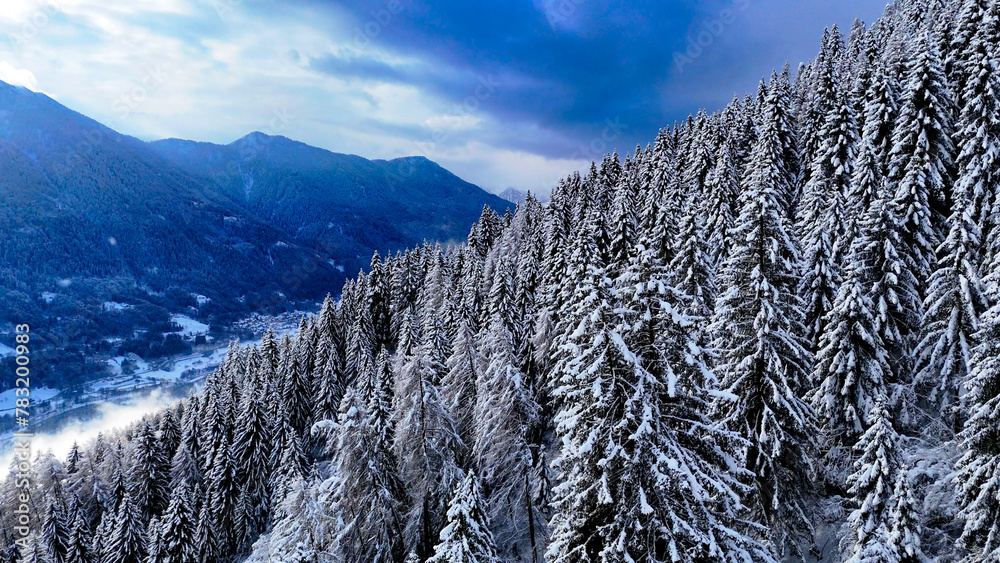 Aerial pictures made with a dji mini 4 pro drone over Pinzolo, in the Dolomites, Italy.