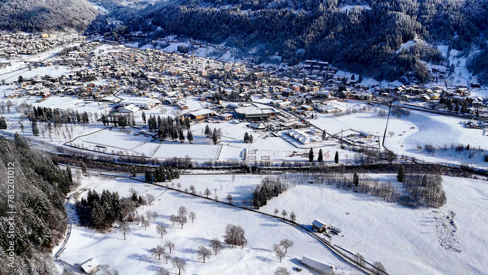 Aerial pictures made with a dji mini 4 pro drone over Pinzolo, in the Dolomites, Italy.