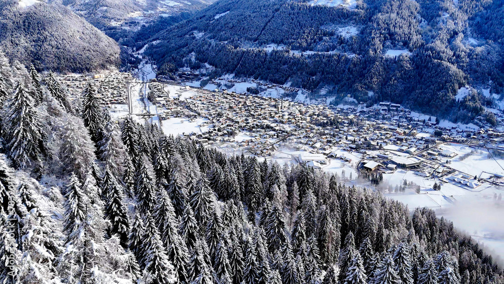 Aerial pictures made with a dji mini 4 pro drone over Pinzolo, in the Dolomites, Italy.