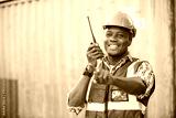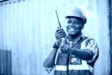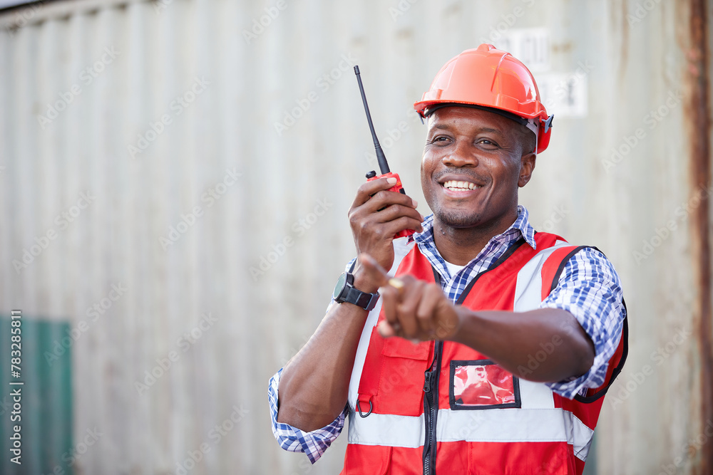 African factory worker or engineer using walkie talkie and talking about work in containers warehouse storage