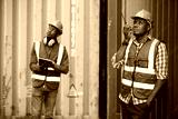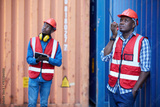 African factory worker or engineer using walkie talkie and talking about work in containers warehouse storage