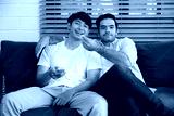 LGBT gay couple watching tv and eating popcorn in living room
