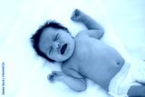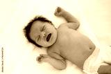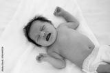 An expressive newborn baby cries while lying on a white blanket, displaying raw emotion.