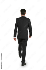 A man in a business suit walking away, isolated on a white background, depicting a corporate or professional concept