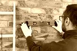 Handyman with spirit level working in a new home interior.
