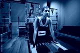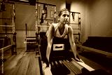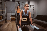 Young woman exercising in a gym with personal trainer on pilates machine.