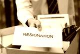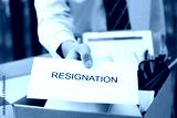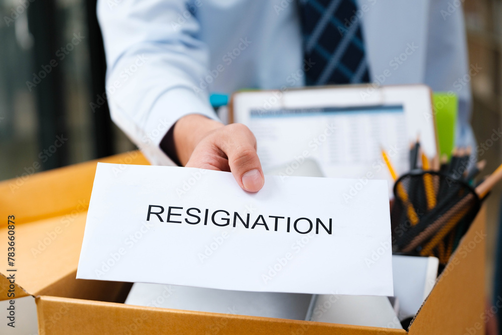 Man's hand presenting a resignation letter, office box with belongings in the back.