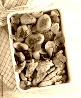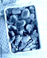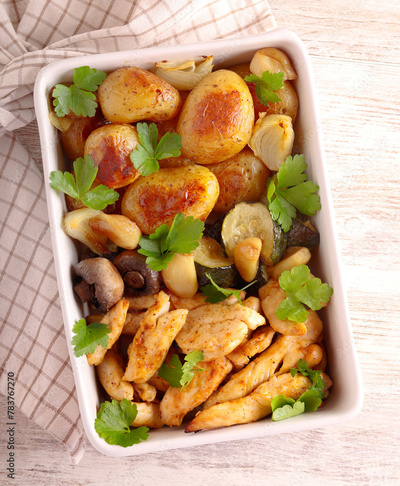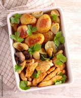 Roast turkey breast strips with mushrooms, potatoes and zucchini