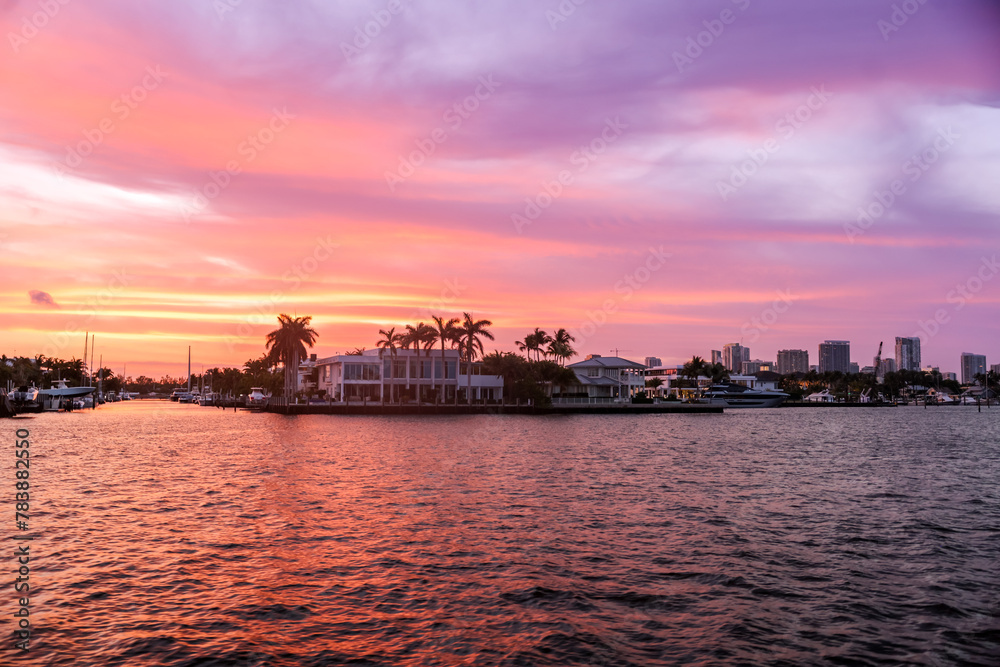 Fort Lauderdale, Florida - March 23, 2024: Mansions and luxury yachts at sunset along the canals of Fort Lauderdale, Florida