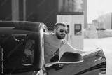 Stylish bearded man in sunglasses getting out of a modern blue electric car, showcasing eco-friendly transportation.