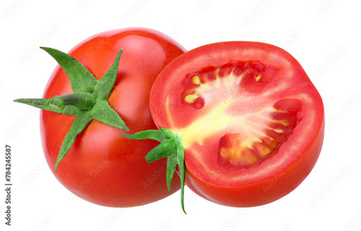 red fresh tomatoes and half isolated, transparent PNG, PNG format, juicy, cut out