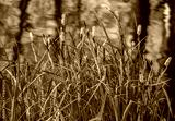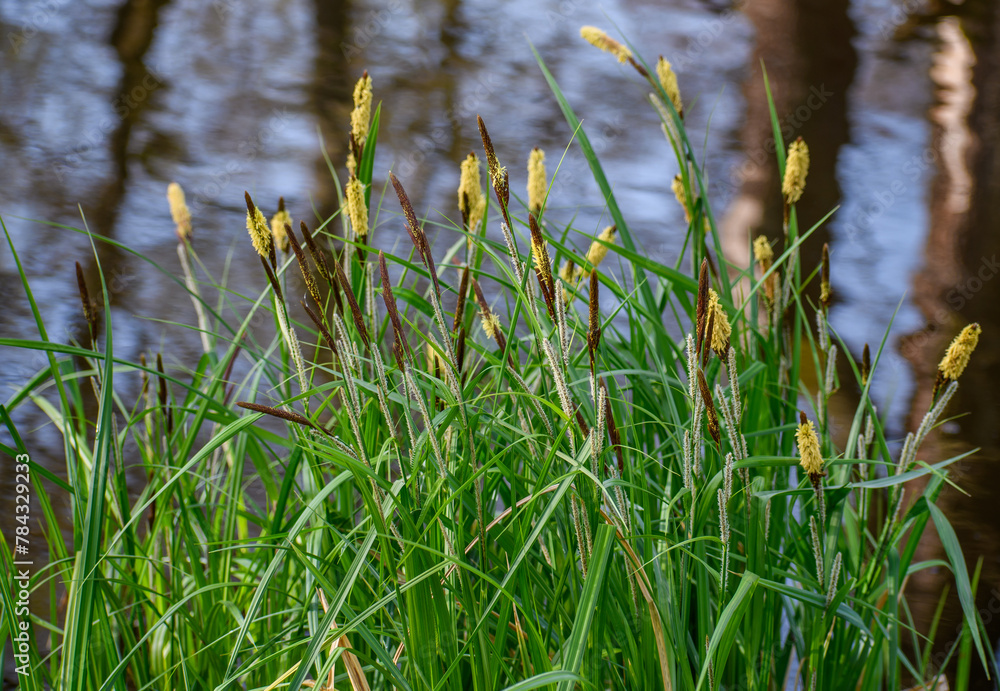 Turzyca zaostrzona, trawa ozdobna rośnie przy oczku wodnym, kojący widoczek