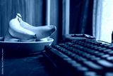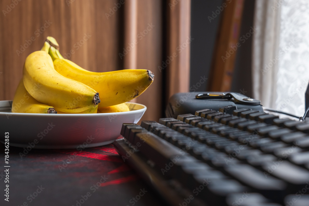 Fresh ripe banana fruit on home office table next to pc monitor