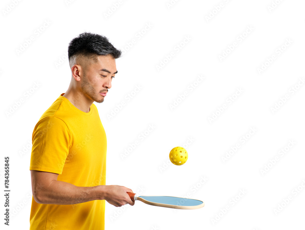oriental young man in yellow t-shirt with paddle and pickleball ball on white background