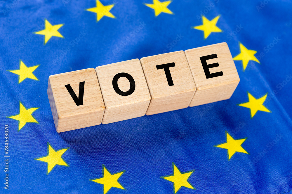 Voting in European Union Countries, Concept, Word Vote written on wooden blocks inside the EU flag