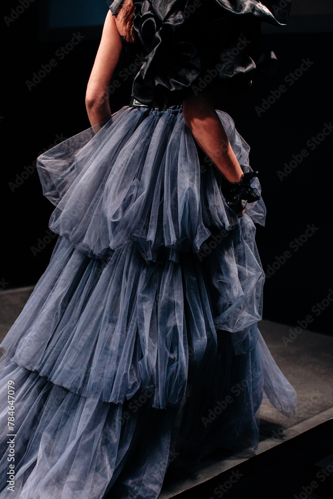 Cute long fluffy blue dress on a female figure on a black background. Fashion show details
