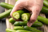 Raw Organic Mini Baby Cucumbers on wooden board. Ready to Eat