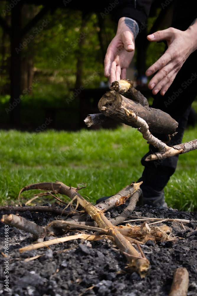man throws wood on fire