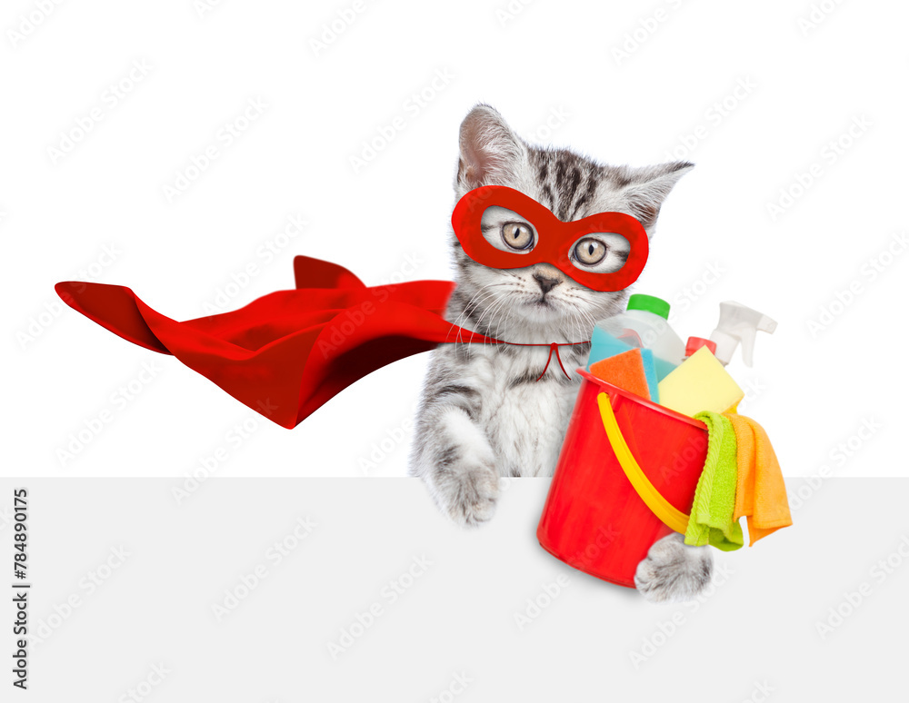 Cute kitten wearing superhero costume holds bucket with washing fluids above empty white banner. Isolated on white background