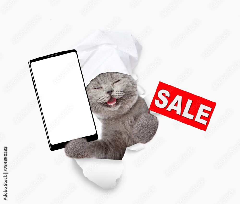 Happy cat wearing chef's hat looking through the hole in white paper showing smartphone with white blank screen in it paw and holding signboard with labeled "sale"