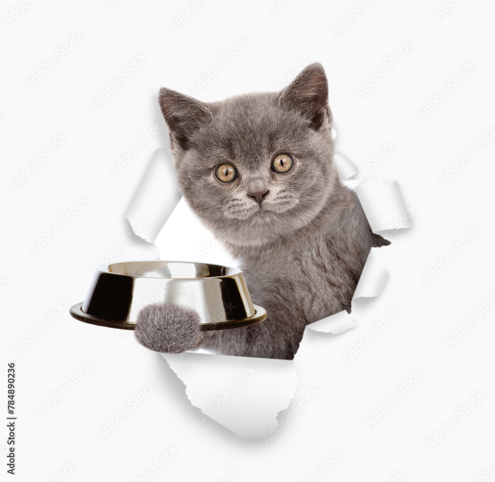 Cute Kitten looks through the hole in white paper and holds empty bowl