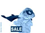Funny Mastiff puppy wearing superhero costume looking away on empty space and showing signboard with labeled "sale". Isolated on white background