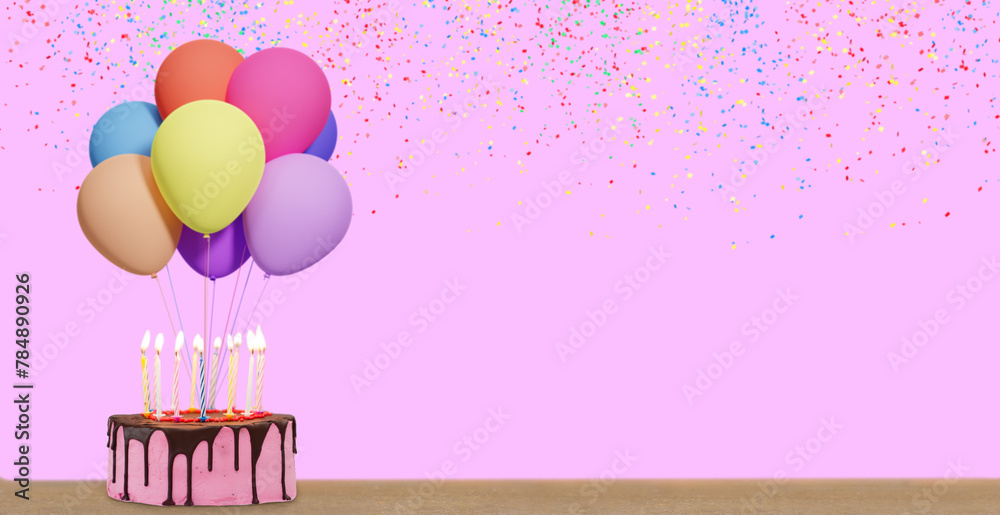 Birthday cake with bunch of colorful balloons on pink background with confetti. Empty space for text. 3d rendering