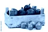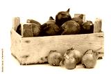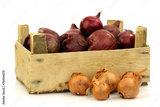 red and brown onions in a wooden box on a white background