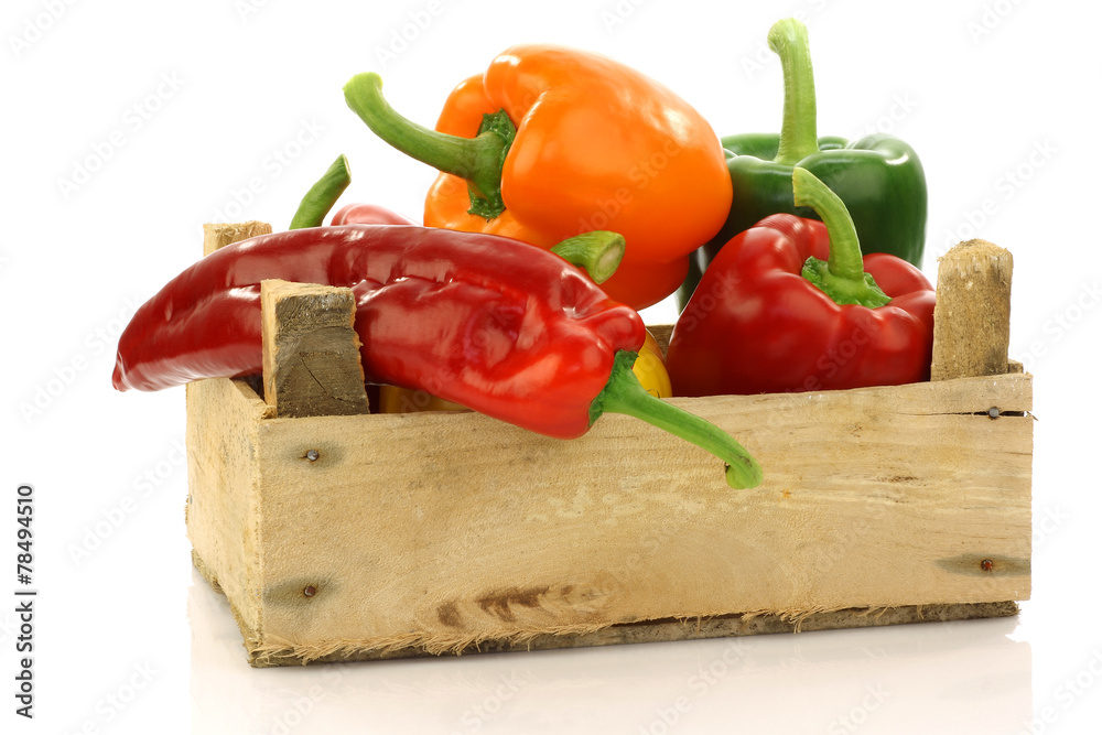 red,yellow and green bell peppers (capsicum) in a wooden crate