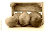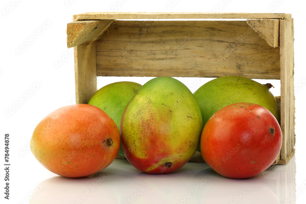 mango fruit and a cut one in a wooden box on a white background